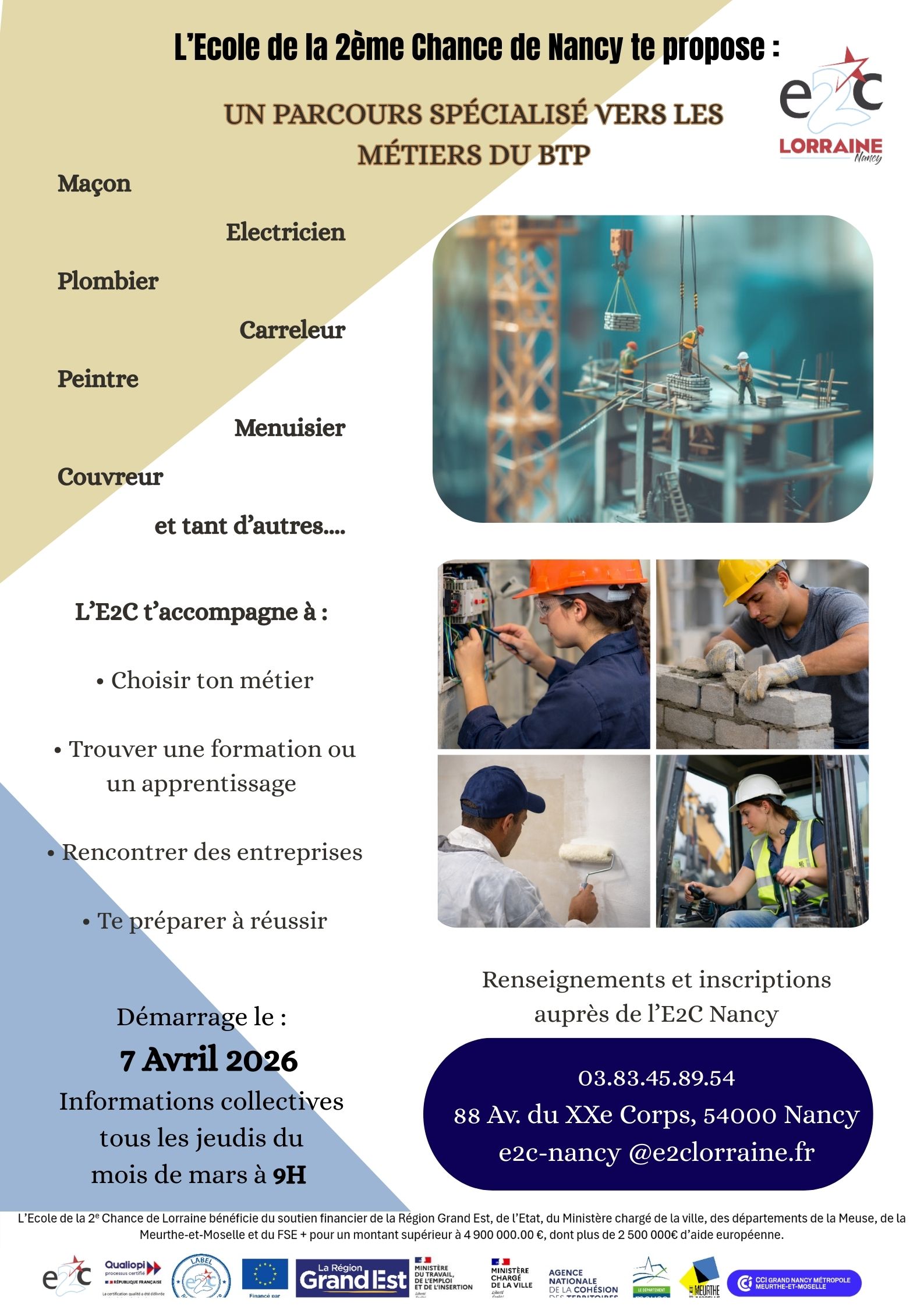 Un groupe dédié aux métiers du BTP va ouvrir à l’E2C de Nancy et démarrera le 7 avril.